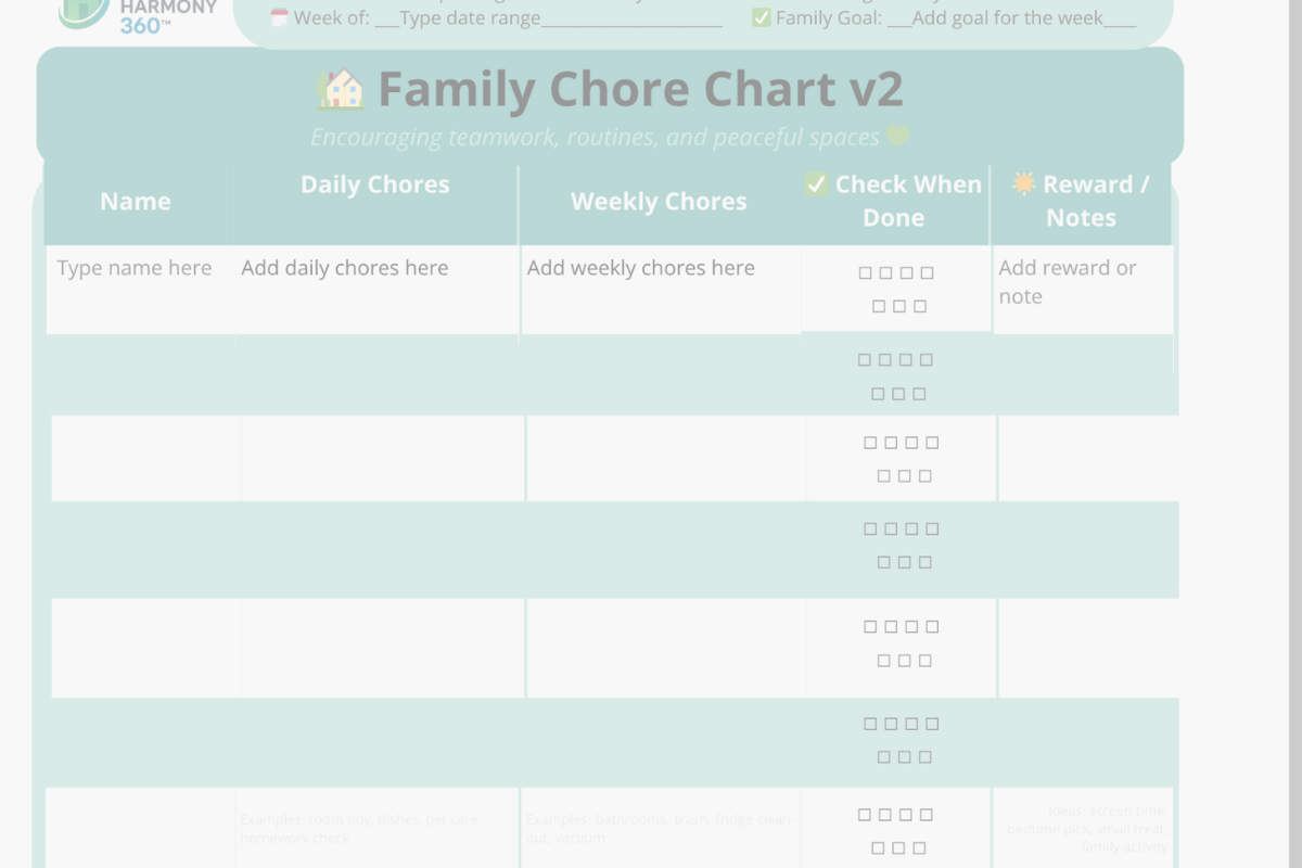 Meet the Family Chore Chart v2 — my first official Home Harmony product! This printable, editable chore chart is designed for real families, including multigenerational homes and weekend routines. It’s simple, customizable, and ready to bring more calm and structure to your week.